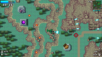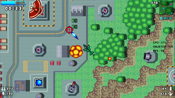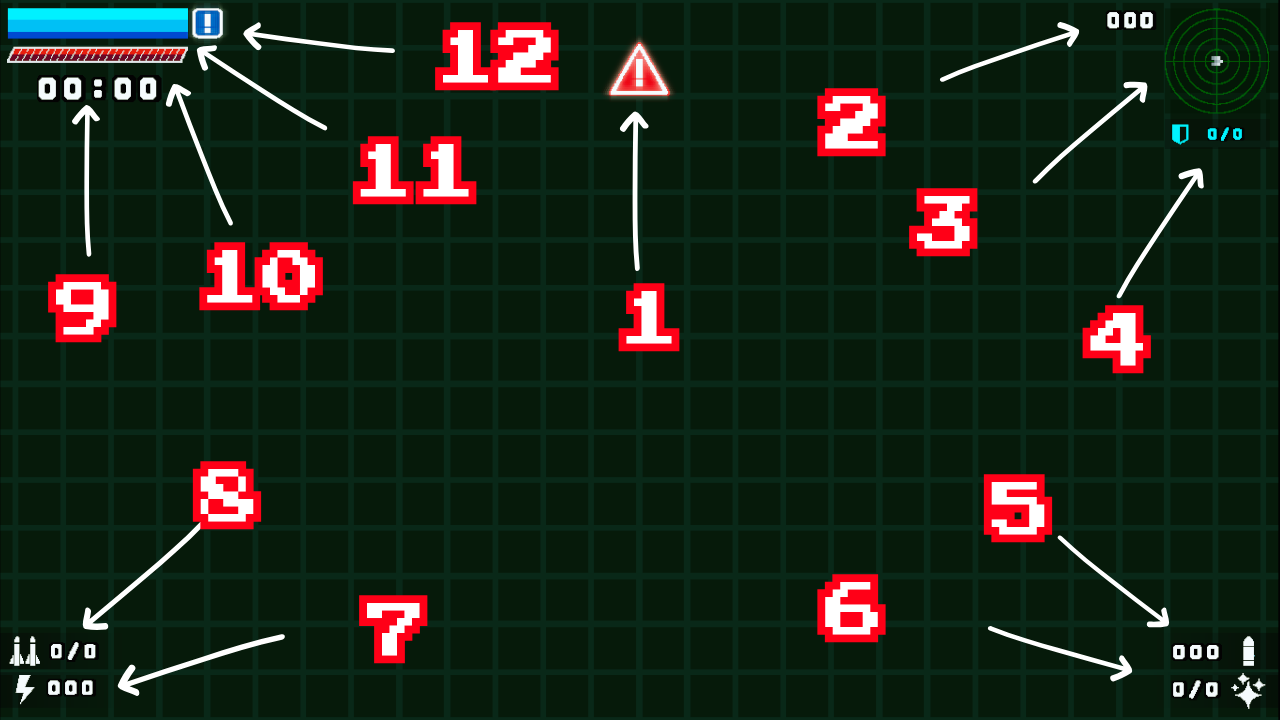 * 1 - ALARME DE MÍSSIL PRÓXIMO * 2 - PONTUAÇÃO * 3 - MINI MAPA * 4 - BLINDAGEM * 5 - QUANTIDADE DE BALAS * 6 - QUANTIDADE SINALIZADORES * 7 - VELOCIDADE * 8 - QUANTIDADE DE MISSÕES * 9 - CRONÔMETRO * 10 - BARRA DE VIDA DO CHEFÃO * 11 - BARRA DE COMBUSTÍVEL * 12 - ALARME DE COMBUSTÍVEL BAIXO