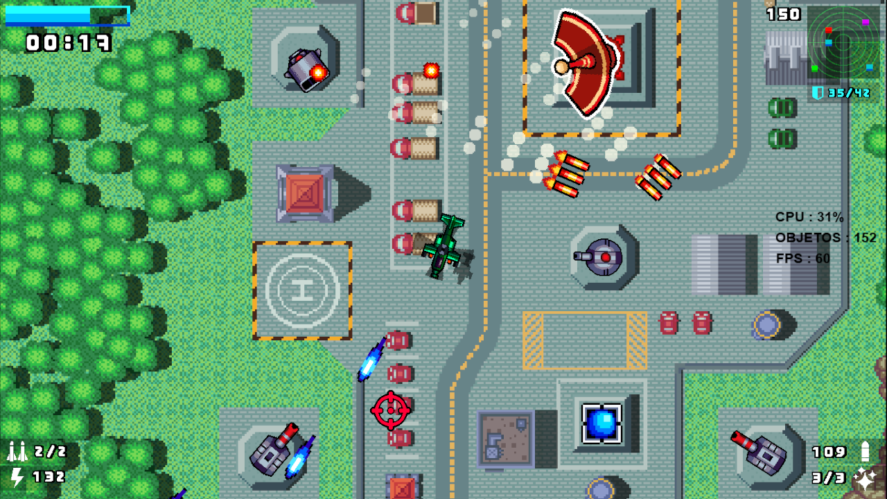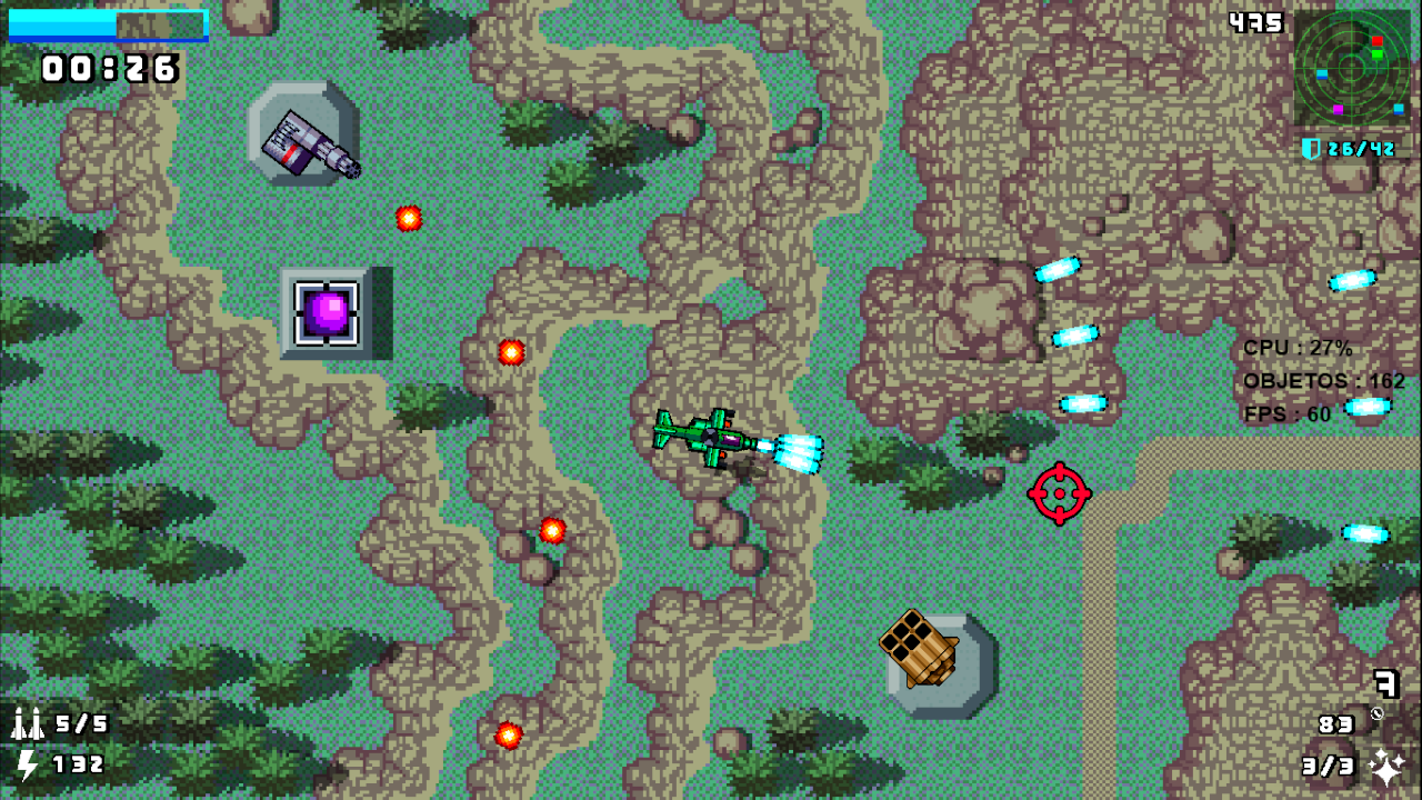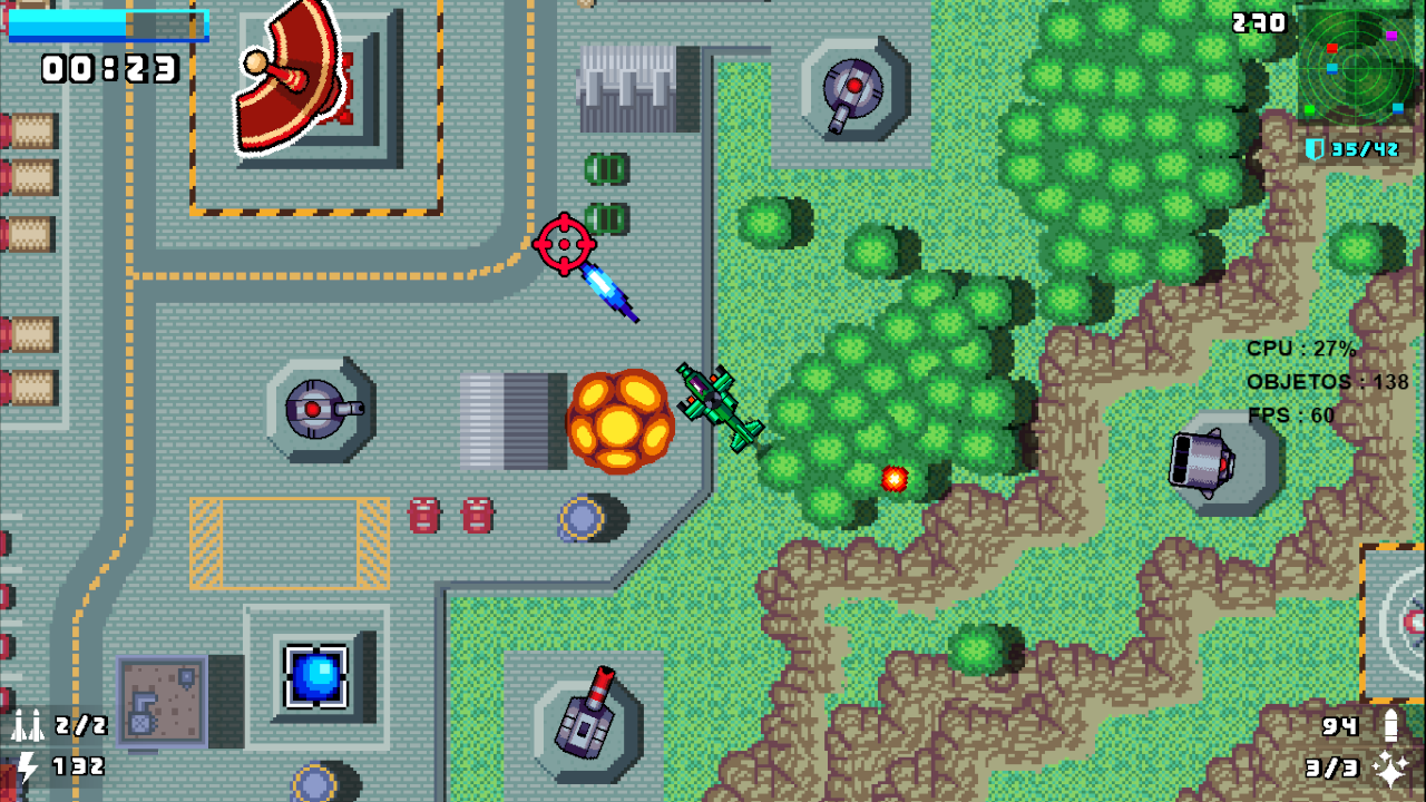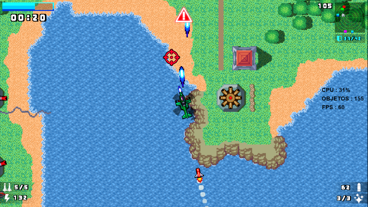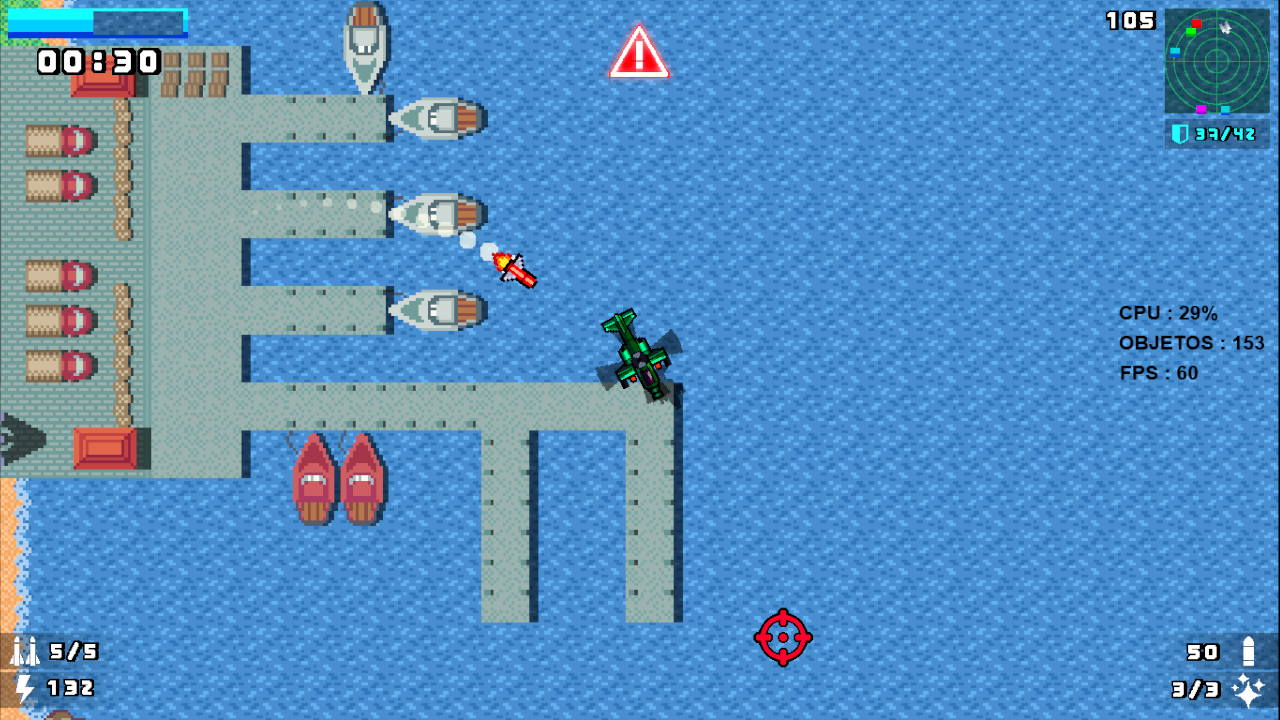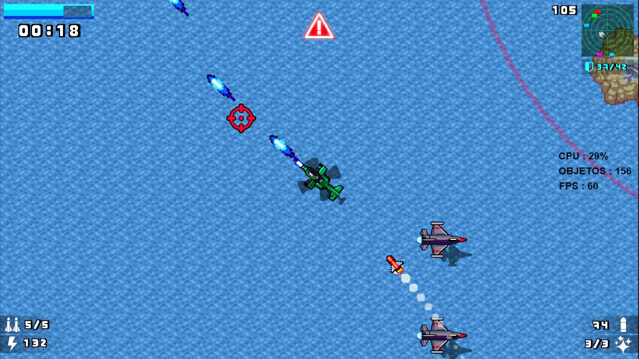 ⌨️🖱Controles Controles no teclado * Movimentação livre ( segue a seta do mouse ) * Tecla ( Q ) – Atirar * Tecla ( espaço ) – acelerar * Tecla ( E ) – disparar sinalizadores * Tecla ( shift ) – pausar * Tecla ( T ) – para disparar missil * CONTROL - para voltar